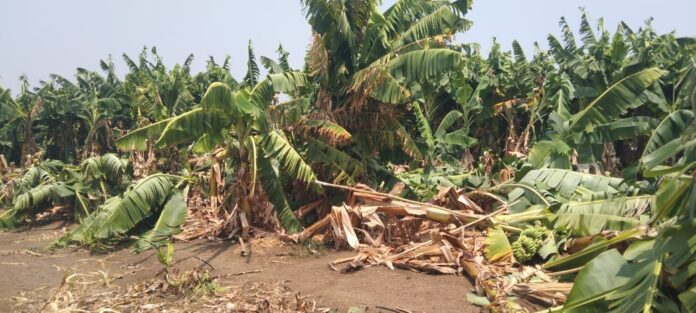 ಅಫಜಲಪುರ : ತಾಲೂಕಿನ ಸುತ್ತಮುತ್ತ ಶನಿವಾರ ರಾತ್ರಿ ಗುಡುಗು ಸಿಡಿಲು ಸಹಿತ ಸುರಿದ ಭಾರಿ ಬಿರುಗಾಳಿಯೊಂದಿಗೆ ಆರ್ಭಟಿಸಿದ ಮಳೆ ತಾಲೂಕಿನ ಬಳೂರ್ಗಿ ಗ್ರಾಮದಲ್ಲಿ ಬಾಳೆ ತೋಟ ನೆಲಸಮ ಮಾಡಿದೆ.