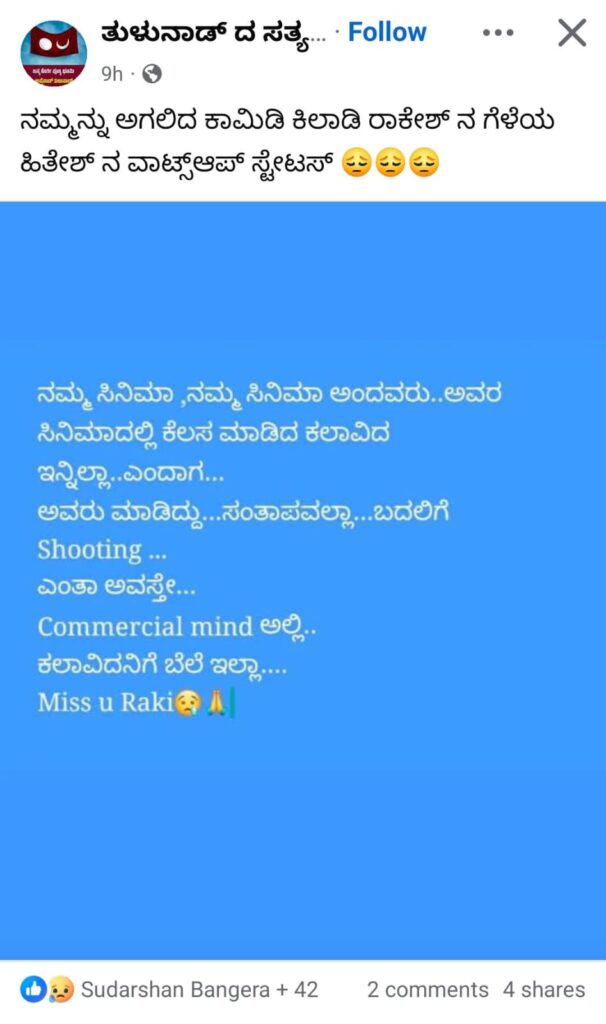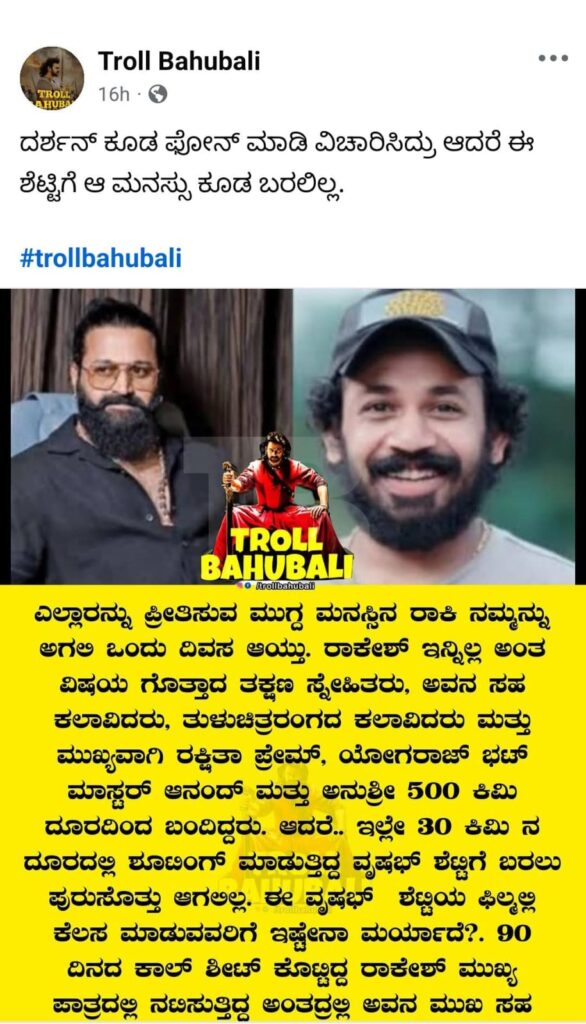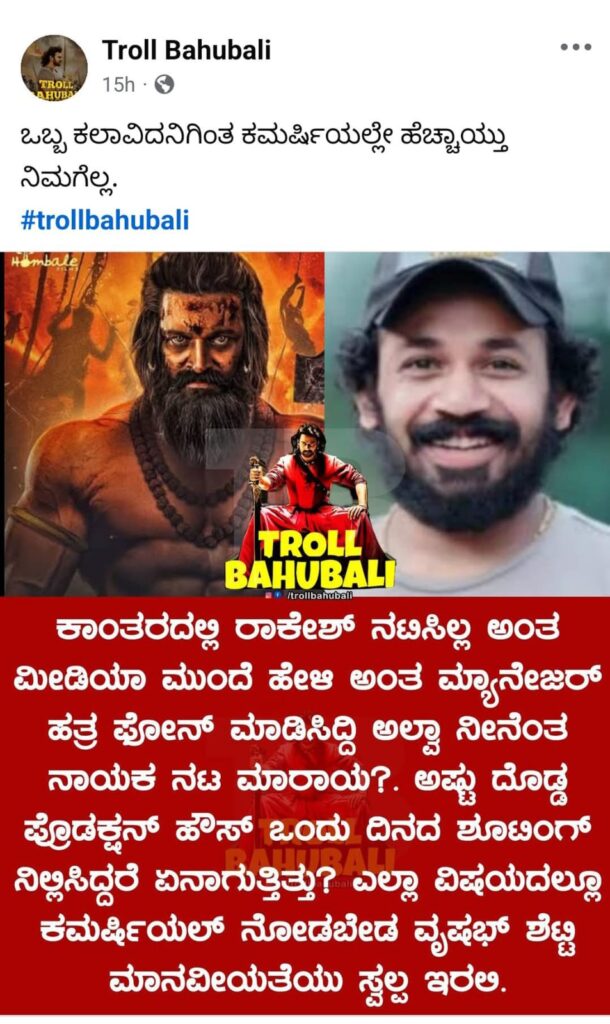 ಕಾಂತಾರ ಚಾಪ್ಟರ್ 1 ವಿಶೇಷ ಪಾತ್ರದಲ್ಲಿ ನಟಿಸುತ್ತಿದ್ದ ರಾಕೇಶ್ ಪೂಜಾರಿ ತನ್ನ ಚಿತ್ರತಂಡದ ಕಲಾವಿದನ ಅಂತಿಮ ದರ್ಶನ ಪಡೆಯಲು ಡಿವೈನ್ ಸ್ಟಾರ್ ರಿಷಬ್ ಶೆಟ್ಟಿ ಭೇಟಿ ನೀಡದ ಹಿನ್ನೆಲೆ ರಾಕೇಶ್ ಅಗಲಿ ಎರಡು ದಿನ ಕಳೆದರೂ ಈ ಹಿನ್ನಲೆ ಸಾಮಾಜಿಕ ಜಾಲತಾಣಗಳಲ್ಲಿ ರಿಷಬ್ ಶೆಟ್ಟಿಗೆ ಕ್ಲಾಸ್ ತೆಗೆದುಕೊಂಡಿದ್ದಾರೆ. “ಕಲಾವಿದನಿಗಿಂತ ಕಮರ್ಶಿಯಲ್ ಹೆಚ್ಚಾಯ್ತಾ” ಎಂಬ ಟ್ಯಾಗ್ ಲೈನ್ ವೈರಲ್ ಆಗಿದ್ದು ಸದ್ಯ ಉಡುಪಿಯ ಬೈಂದೂರಿನಲ್ಲಿ ಕಾಂತಾರ ಚಾಪ್ಟರ್ 1 ಚಿತ್ರೀಕರಣ ನಡೆಯುತ್ತಿದೆಂದು ಮಾಹಿತಿ ದೊರೆತಿದೆ.