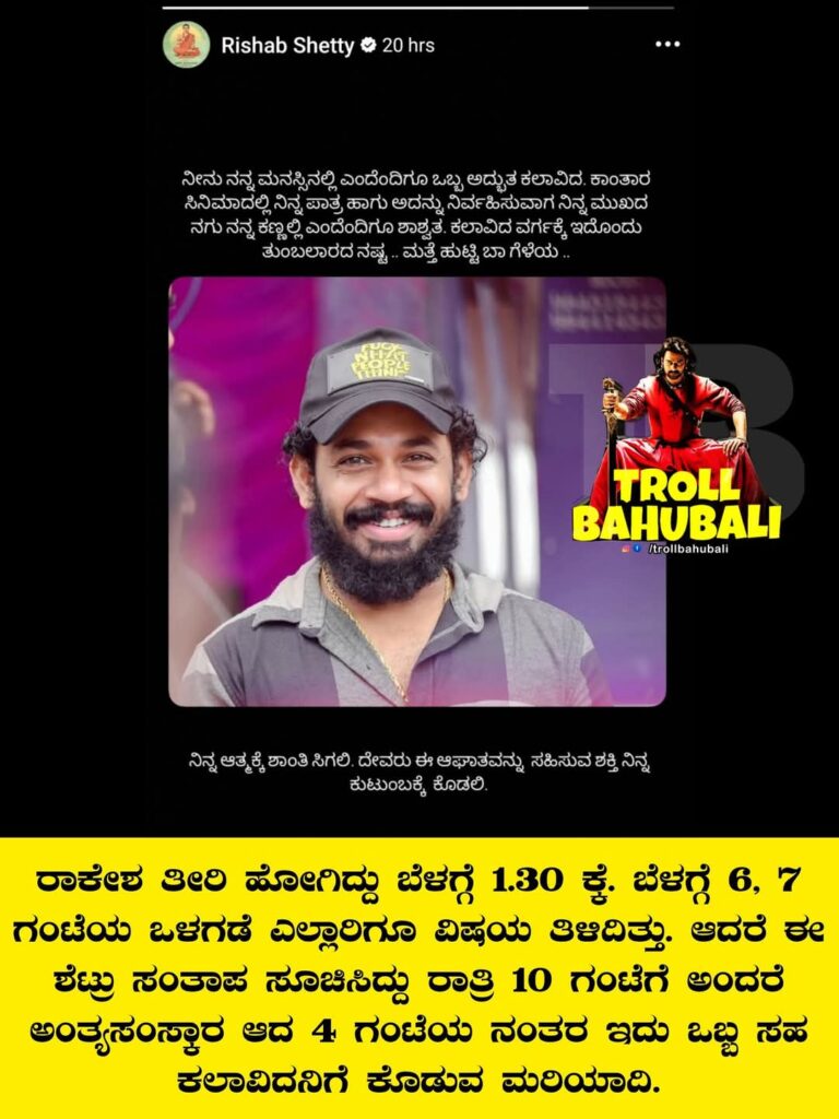 ಉಡುಪಿ : ಕಾಂತಾರ ಚಿತ್ರದ ನಟ, ಹಾಸ್ಯ ಕಲಾವಿದ ರಾಕೇಶ್ ಪೂಜಾರಿ ಸಾವನಪ್ಪಿದ್ದು ತಿಳಿದ ವಿಚಾರ ಆದರೆ ರಾಕೇಶ್ ಪೂಜಾರಿ ಮನೆಗೆ ಭೇಟಿ ನೀಡದ ಹಿನ್ನೆಲೆ ರಿಷಬ್ ಶೆಟ್ಟಿ ವಿರುದ್ಧ ಸಾಮಾಜಿಕಜಾಲತಾಣದಲ್ಲಿ ಹಲವರು ಆಕ್ರೋಶ ಹೊರಹಾಕಿದ ಘಟನೆ ನಡೆದಿದೆ.