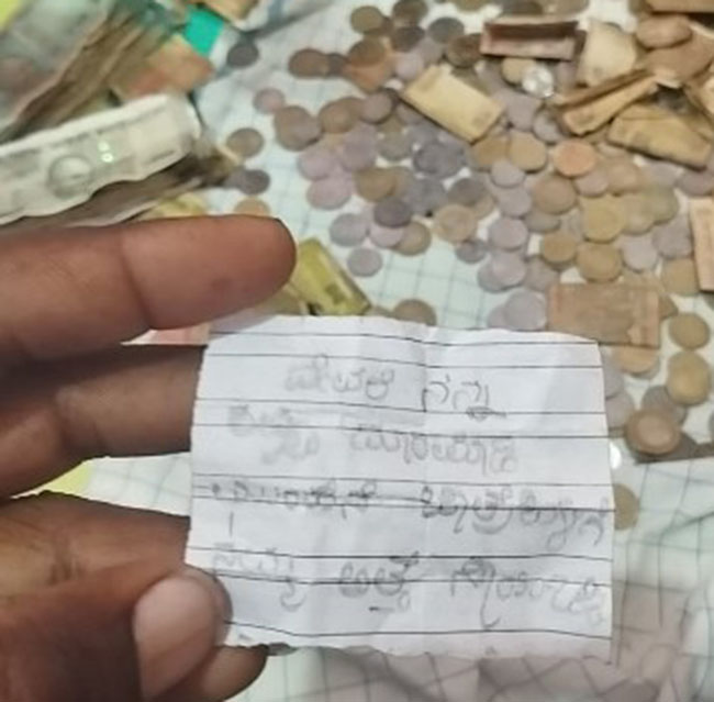 ಬೆಳಗಾವಿ ಜಿಲ್ಲೆಯ ರಾಯಬಾಗ ತಾಲೂಕಿನ ಖಣದಾಳ ಗ್ರಾಮದಲ್ಲಿ 100 ರೂ ಹಾಗೂ 10 ರೂ ಮುಖಬೆಲೆಯ ನೋಟಿನ ಒಳಗಡೆ ಬಿಳಿಹಾಳೆಯ ಮೇಲೆ ಬರವಣಿಗೆ ಪತ್ತೆಯಾಗಿದ್ದು ಮುಂದಿನ ವರ್ಷದ ಜಾತ್ರೆ ಬರುವ ಮುಂಚೆ ನಮ್ಮ ಅತ್ತೆ ಸಾಯಲಿ ಎಂದು ನೋಟಿನ ಜೊತೆ ಚೀಟಿ ವ್ಯಕ್ತಿ ಅಂಟಿಸಿದ್ದಾನೆ.ಈ ಬಗ್ಗೆ ದೇವಸ್ಥಾನ ಕಮೀಟಿಯಿಂದ ಹುಂಡಿಯ ಹಣ ಎಣಿಕೆ ಸಂದರ್ಭ ಬೆಳಕಿಗೆ ಬಂದಿದ್ದು ಈ ನೋಟ ನ್ನು ಕಂಡು ದೇವಾಲಯದ ಸಿಬ್ಬಂದಿಗಳು ದಂಗಾಗಿದ್ದಾರೆ.