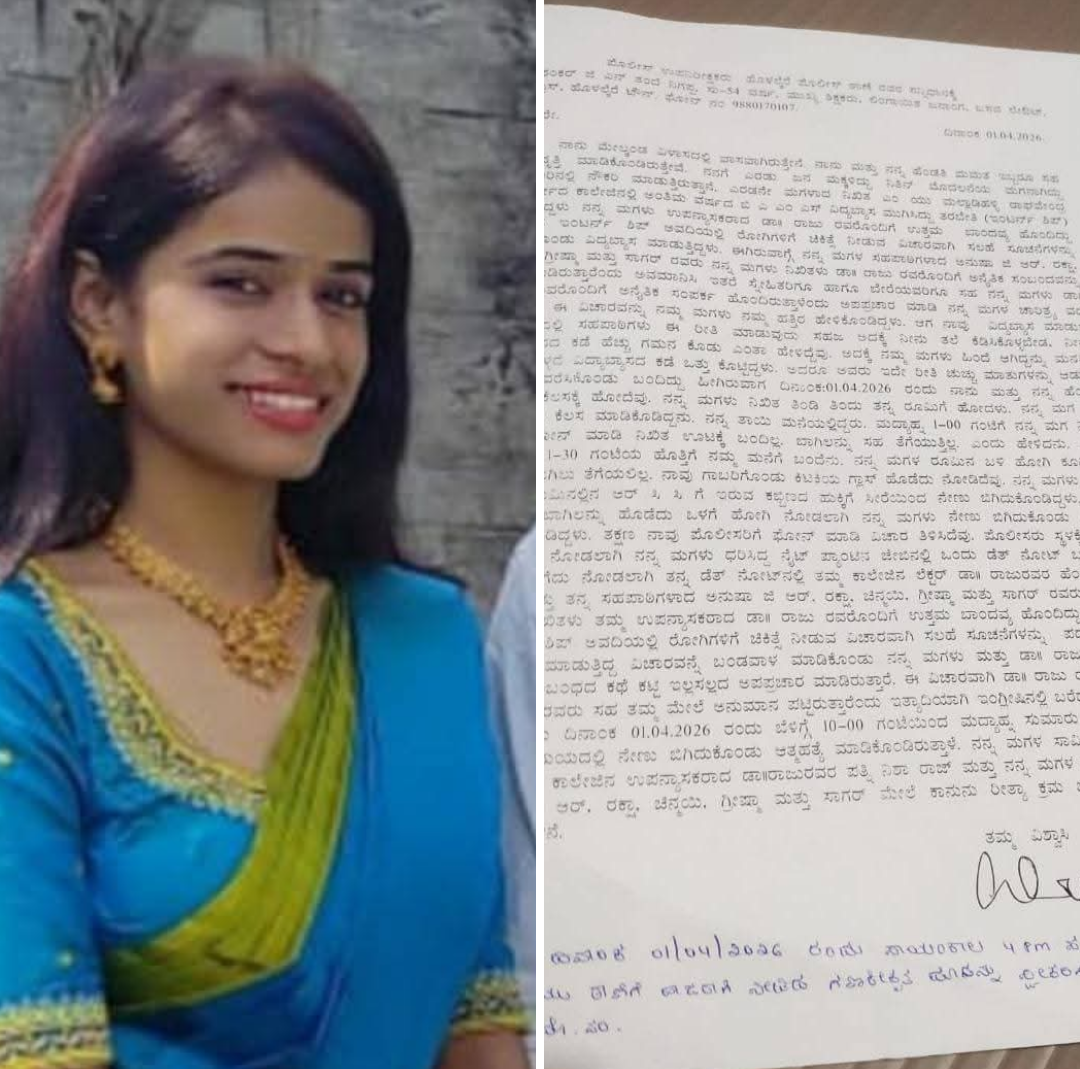 ಚಿತ್ರದುರ್ಗ ; ಉಪನ್ಯಾಸಕನ ಜೊತೆ ಅನೈತಿಕ ಸಂಬಂಧದ ಅರೋಪ,ಡೆತ್ ನೋಟ್ ಬರೆದಿಟ್ಟು BMS ವಿಧ್ಯಾರ್ಥಿನಿ ಆತ್ಮಹತ್ಯೆ.