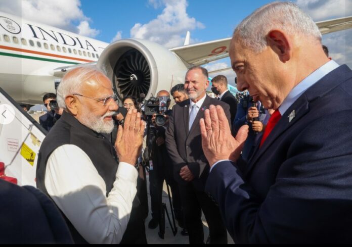 ಬುಧವಾರ ಮಧ್ಯಾಹ್ನ ಟೆಲ್ಅವೀವ್ ವಿಮಾನ ನಿಲ್ದಾಣದಲ್ಲಿ ಬಂದಿಳಿದ ಮೋದಿಯವರನ್ನು ಖುದ್ದು ಇಸ್ರೇಲ್ ಪ್ರಧಾನಿ ಬೆಂಜಮಿನ್ ನೆತನ್ಯಾಹು ಹಾಗೂ ಪತ್ನಿ ಸಾರಾ ನೆತನ್ಯಾಹು ಹಾಜರಿದ್ದು ಸ್ವಾಗತಿಸಿದರು. ನಂತರ ಇಸ್ರೇಲ್ನ ಸಂಸತ್ತಿನಲ್ಲಿ ಭಾಷಣ ಮಾಡಿದ ಪ್ರಧಾನಿ ನರೇಂದ್ರ ಮೋದಿ, ಹಮಾಸ್ ಉಗ್ರರು ೨೦೨೩ರ ಅಕ್ಟೋಬರ್ ೭ರಂದು ಇಸ್ರೇಲ್ನಲ್ಲಿ ನಡೆಸಿದ್ದ ಅನಾಗರಿಕ ರೀತಿಯ ಭಯೋತ್ಪಾದಕ ದಾಳಿಯನ್ನು ತೀವ್ರವಾಗಿ ಖಂಡಿಸಿದರು. ಆದರೆ ಪ್ಯಾಲೆಸ್ತೇನ್ ಬಗ್ಗೆ ಯಾವುದೇ ಮಾತನ್ನು ಆಡದೆ ಮಾತು ಮುಗಿಸಿದರು.