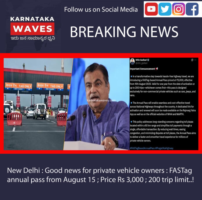 ನವದೆಹಲಿ : ಸರ್ಕಾರವು 3,000 ರೂ.ಗಳ ಬೆಲೆಯ ಫಾಸ್ಟ್ಟ್ಯಾಗ್ ಆಧಾರಿತ ವಾರ್ಷಿಕ ಪಾಸ್ ಅನ್ನು ಪರಿಚಯಿಸುತ್ತಿದೆ ಎಂದು ರಸ್ತೆ ಸಾರಿಗೆ ಮತ್ತು ಹೆದ್ದಾರಿ ಸಚಿವ ನಿತಿನ್ ಗಡ್ಕರಿ ಬುಧವಾರ ಎಕ್ಸ್ ಪೋಸ್ಟ್ನಲ್ಲಿ ತಿಳಿಸಿದ್ದಾರೆ.