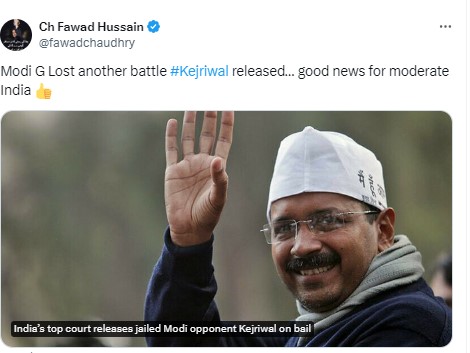 ಅರವಿಂದ್ ಕೇಜ್ರಿವಾಲ್ ಬಿಡುಗಡೆ ಆಧುನಿಕ ಭಾರತಕ್ಕೆ ಸಿಕ್ಕಿದ ಗುಡ್ ನ್ಯೂಸ್ ಎಂದಿದ್ದಾರೆ. ಫಾವದ್ ಚೌಧರಿ ಟ್ವೀಟ್‌ಗೆ ಪಾಕಿಸ್ತಾನದ ಹಲವು ನಾಗರೀಕರು ಪ್ರತಿಕ್ರಿಯೆ ನೀಡಿದ್ದಾರೆ. ನಿಜಕ್ಕೂ ಇದು ಗುಡ್ ನ್ಯೂಸ್, ಭಾರತದಲ್ಲಿ ಕೋರ್ಟ್ ಕಾರ್ಯನಿರ್ವಹಿಸುತ್ತಿದೆ ಅನ್ನೋದು ಖಾತ್ರಿಯಾಯಿತು. ಭಾರತದಲ್ಲಿ ನ್ಯಾಯಕ್ಕೆ ಸತತ ಹೋರಾಟದ ಅವಶ್ಯಕತೆ ಇದೆ ಎಂದು ಅಭಿಪ್ರಾಯ ವ್ಯಕ್ತಪಡಿಸಿದ್ದು ಮೋದಿಜಿ ಮತ್ತೊಂದು ಹೋರಾಟದಲ್ಲಿ ಮುಗ್ಗರಿಸಿದ್ದಾರೆ