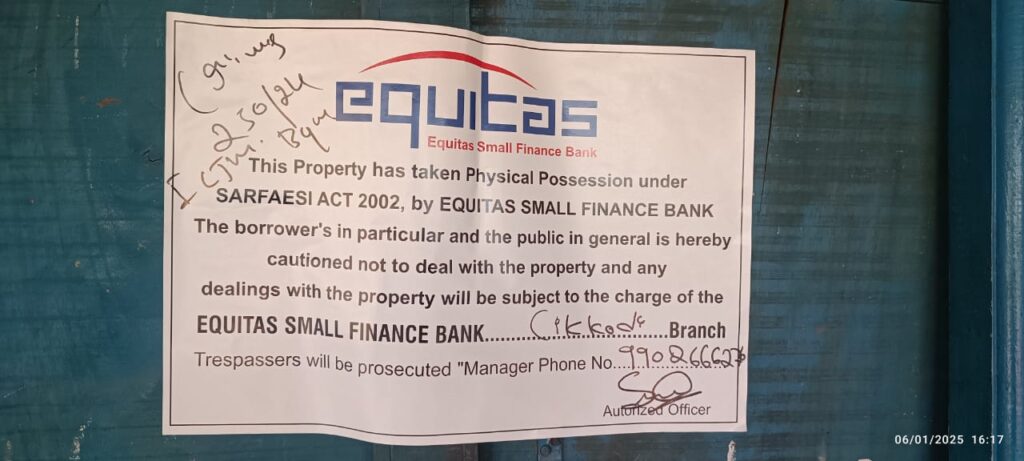 ಸಾಲ ಮರು ಪಾವತಿ ಮಾಡಿಲ್ಲ ಎಂದು ಚೆನೈ ಮೂಲದ ಇಕ್ವಿಟಾಸ್ ಸ್ಮಾಲ್ ಫೈನಾನ್ಸ್ ಬ್ಯಾಂಕ್ ಸಿಬ್ಬಂದಿ‌ ಮನೆಯನ್ನುವ ಸೀಜ್ ಮಾಡಿದ್ದು
