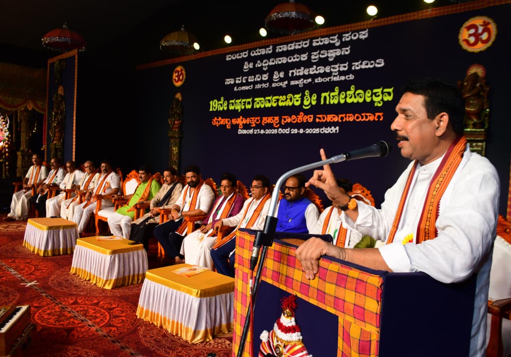 ಅವರು ಮಂಗಳೂರಿನ ಬಂಟ್ಸ್ ಹಾಸ್ಟೆಲ್ ನಲ್ಲಿ ಬಂಟರ ಯಾನೆ ನಾಡವರ ಮಾತೃ ಸಂಘ, ಶ್ರೀ ಸಿದ್ದಿವಿನಾಯಕ ಪ್ರತಿಷ್ಠಾನ ಹಾಗೂ ಸಾರ್ವಜನಿಕ ಶ್ರೀ ಗಣೇಶೋತ್ಸವ ಸಮಿತಿಯಿಂದ ನಡೆಯುತ್ತಿರುವ 19ನೇ ವರ್ಷದ ಸಾರ್ವಜನಿಕ ಶ್ರೀ ಗಣೇಶೋತ್ಸವದ ಶೋಭಾಯಾತ್ರೆಗೆ ಚಾಲನೆ ನೀಡಿ ಮಾತನಾಡಿದರು.