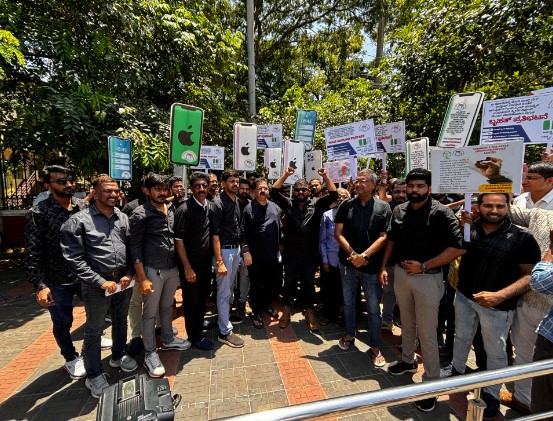 ಮಂಗಳೂರು : ಆಪಲ್ ಐ ಫೋನ್ ಸರ್ವಿಸ್ ಸೆಂಟರ್ ವಿರುದ್ಧ ರಿಟೇಲರ್ ಹಾಗೂ ಗ್ರಾಹಕರ ಬೃಹತ್ ಪ್ರತಿಭಟನಾ ಜಾಥಾ ಮಂಗಳವಾರ ನಗರದಲ್ಲಿ ಜರುಗಿತು. ಜ್ಯೋತಿ ಸರ್ಕಲ್ ನಿಂದ ಆಪಲ್ ನ ಸರ್ವಿಸ್ ಸೆಂಟರ್ ಮ್ಯಾಪಲ್ ನ ಎದುರುಗಡೆಯಿಂದ ಕ್ಲಾಕ್ ಟವರ್ ವರಗೆ ಮೆರವಣಿಗೆಯಲ್ಲಿ ಸಾಗಿಬಂದ ಪ್ರತಿಭಟನಾಕಾರರು ಕ್ಲಾಕ್ ಟವರ್ ಬಳಿ ತಮ್ಮ ಬೇಡಿಕೆಗಳನ್ನು ಕೂಡಲೇ ಪೂರೈಸುವಂತೆ ಸಂಸ್ಥೆಯನ್ನು ಆಗ್ರಹಿಸಿದರು.