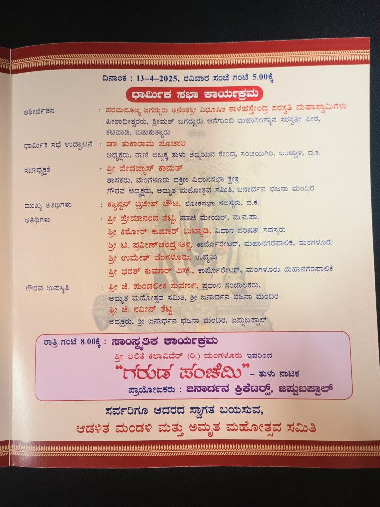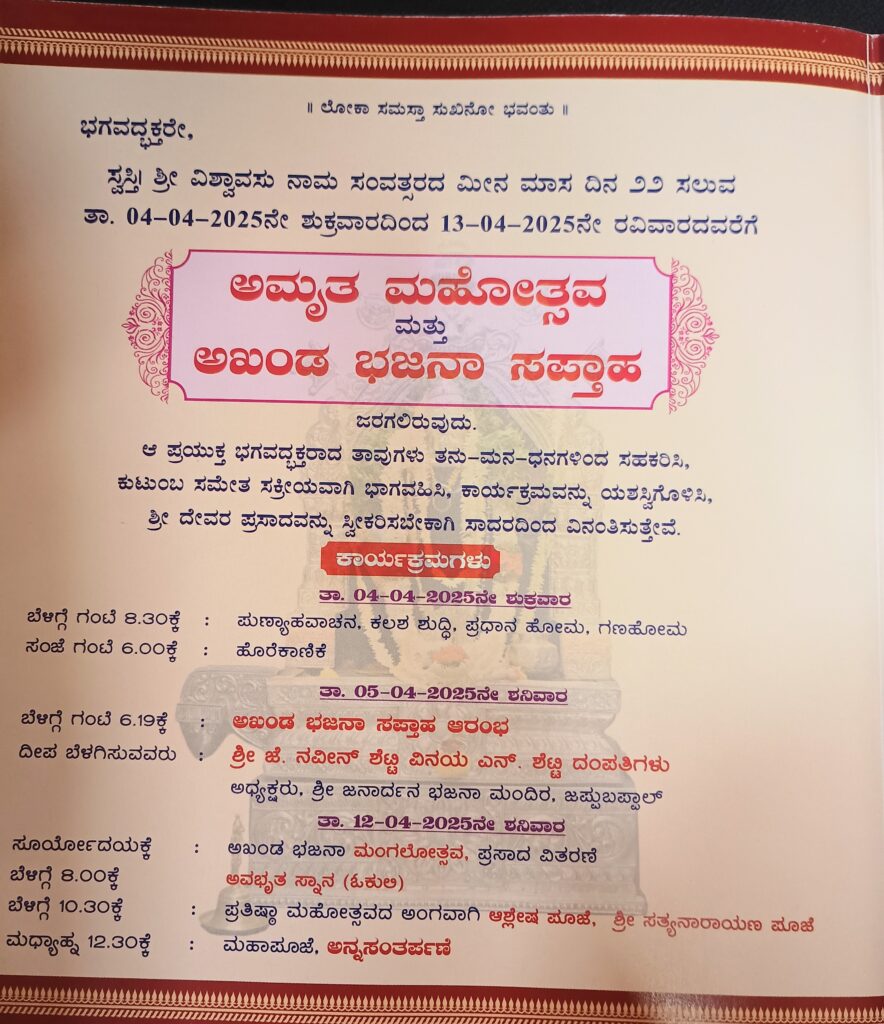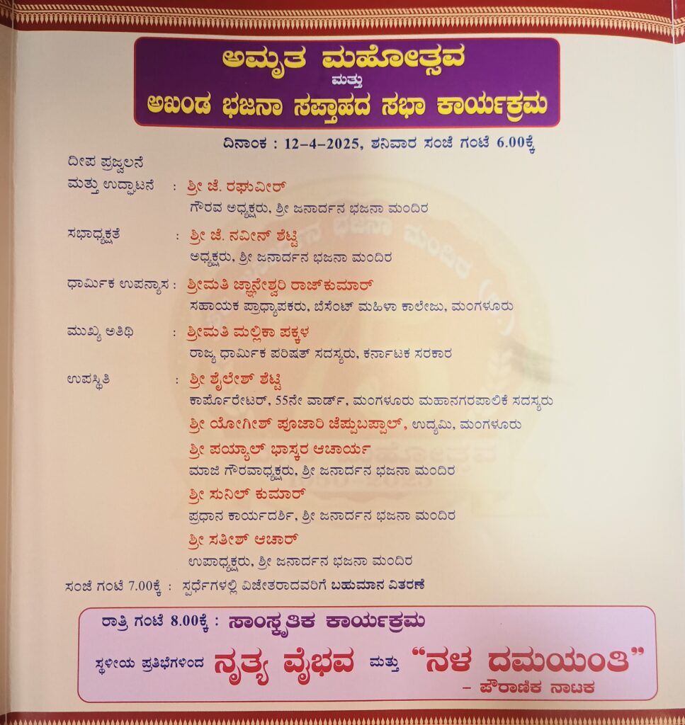 ಮಂದಿರ ಸ್ಥಾಪನೆಯಾಗಿ 75 ವರ್ಷಕ್ಕೆ ಪಾದಾರ್ಪಣೆಗೊಂಡ ಈ ಶುಭ ವರುಷದಲ್ಲಿ ಶ್ರೀ ಜನಾರ್ದನ ಸ್ವಾಮಿಯ ಪ್ರೇರಣೆ ಮತ್ತು ಸರ್ವ ಸದಸ್ಯರ ಅಪೇಕ್ಷೆಯಂತೆ ಲೋಕ ಕಲ್ಯಾಣಾರ್ಥವಾಗಿ ಮಂದಿರದ ಅಮೃತ ಮಹೋತ್ಸವವನ್ನು ಊರ ಪರವೂರ ಭಕ್ತಜನರ ಸಹಕಾರದೊಂದಿಗೆ ತಾ: 5.4.2025 ರಿಂದ 12.4.2025ರ ವರೆಗೆ ಅಖಂಡ ಭಜನಾ ಸಪ್ತಾಹವನ್ನು ಆಚರಿಸುವುದಾಗಿ ನಿರ್ಧರಿಸಿದ್ದು ಅಮೃತ ಮಹೋತ್ಸವದ ಸವಿನೆನಪಿಗಾಗಿ ಮಂದಿರಕ್ಕೆ ಹೊಂದಿಕೊಂಡಿರುವ 7 ಸೆಂಟ್ಸ್ ಜಾಗವನ್ನು ಖರೀದಿಸುವುದೆಂದು ನಿರ್ಧರಿಸಿದ್ದೇವೆ ಎಂದಿದ್ದಾರೆ.ಮಂದಿರ ಖರೀದಿಸಲಿರುವ ಜಾಗ, ಆವರಣಗೋಡೆ, ಮೇಲ್ಬಾವಣಿ ಮತ್ತು ಅಮೃತ ಮಹೋತ್ಸವದ ಕಾರ್ಯಕ್ರಮಗಳಿಗೆ ಸುಮಾರು 1.50 ಕೋಟಿ (ಒಂದು ಕೋಟಿ ಐವತ್ತು ಲಕ್ಷ) ವೆಚ್ಚವನ್ನು ಅಂದಾಜಿಸಲಾಗಿದೆ ಮಂದಿರಕ್ಕೆ ಭಕ್ತರ ದೇಣಿಗೆಯನ್ನು ಹೊರತುಪಡಿಸಿ ಬೇರೆ ಯಾವುದೇ ಆದಾಯ ಮೂಲವಿರುವುದಿಲ್ಲ. ಆದುದರಿಂದ ಸಹೃದಯ ಭಕ್ತ ಸಮುದಾಯ ಮತ್ತು ದಾನಿಗಳು ತನು-ಮನ-ಧನದಿಂದ ಸಹಕರಿಸಿ ಮೇಲೆ ತಿಳಿಸಿರುವ ಕಾರ್ಯಕ್ರಮಗಳು ಯಶಸ್ವಿಗೊಳಿಸುವಂತೆ ಪತ್ರಿಕಾಗೋಷ್ಠಿಯಲ್ಲಿ ತಿಳಿಸಿದ್ದಾರೆ.