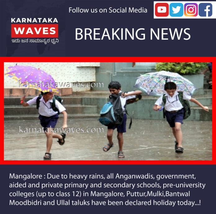ಮಂಗಳೂರು : ದಕ್ಷಿಣ ಕನ್ನಡ ಜಿಲ್ಲೆಯಾದ್ಯಂತ ರೆಡ್ ಅಲರ್ಟ್ ಹಿನ್ನಲೆ ಭಾರೀ ಮಳೆ ಸಾಧ್ಯತೆ ಇರುವುದರಿಂದ ಮಂಗಳೂರು,ಪುತ್ತೂರು,ಬಂಟ್ವಾಳ ಮುಲ್ಕಿ,ಮೂಡಬಿದರೆ, ಉಳ್ಳಾಲ ತಾಲೂಕಿನ ಎಲ್ಲಾ ಅಂಗನವಾಡಿ, ಸರ್ಕಾರಿ, ಅನುದಾನಿತ ಮತ್ತು ಖಾಸಗಿ ಪ್ರಾಥ ಪ್ರೌಢಶಾಲೆ, ಪದವಿ ಪೂರ್ವ ಕಾಲೇಜು, (12 ನೇ ತರಗತಿವರೆಗೆ) ಇಂದು ರಜೆ ಘೋಷಿಸಲಾಗಿದೆ.