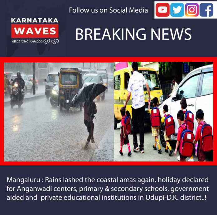 ಮಂಗಳೂರು : ಕರಾವಳಿ ಭಾಗದಲ್ಲಿ ಮತ್ತೆ ಮಳೆ ಆರ್ಭಟ,ಉಡುಪಿ- ದ.ಕ ಜಿಲ್ಲೆಯಲ್ಲಿಅಂಗನವಾಡಿ ಕೇಂದ್ರ, ಪ್ರಾಥಮಿಕ & ಪ್ರೌಢ ಶಾಲೆ, ಸರ್ಕಾರಿ ಅನುದಾನಿತ ಮತ್ತು ಖಾಸಗಿ ವಿದ್ಯಾಸಂಸ್ಥೆಗಳಿಗೆ ರಜೆ ಘೋಷಣೆ..!