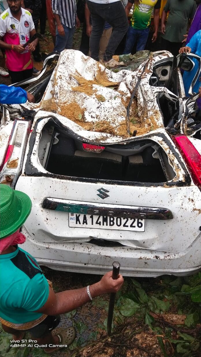 ಕಾರು ಕುಕ್ಕೆ ಸುಬ್ರಹ್ಮಣ್ಯದಿಂದ ಧರ್ಮಸ್ಥಳ ತೆರಳುತ್ತಿದ್ದ ಸಂದರ್ಭದಲ್ಲಿ ಕಾರಿನ ಮೇಲೆ ಬೃಹತ್ ಗಾತ್ರದ ಮರ ಮುರಿದು ಬಿದ್ದಿದೆ. ಮರ ಬಿದ್ದ ಕಾರಣ ಕಾರಿನೊಳಗೆ ಪ್ರಯಾಣಿಕರು ಸಿಲುಕಿಕೊಂಡಿದ್ದು ಬಳಿಕ ಸ್ಥಳೀಯರು ಕಾರಿನೊಳಗಿನಿಂದ ಎಲ್ಲರನ್ನೂ ಹೊರತೆಗೆದು ರಕ್ಷಿಸಿದ್ದಾರೆ.