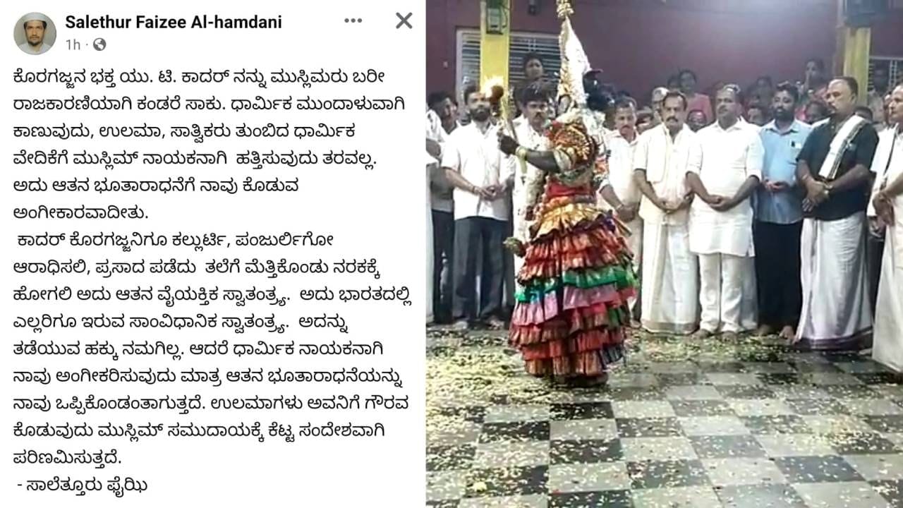 ಆತನ ವೈಯಕ್ತಿಕ ಸ್ವತಂತ್ರ. ಅದು ಭಾರತದಲ್ಲಿ ಎಲ್ಲರಿಗೂ ಇರುವ ಸಂವಿಧಾನಿಕ ಸ್ವಾತಂತ್ರ. ಅದನ್ನು ತಡೆಯುವ ಹಕ್ಕು ನನಗಿಲ್ಲ. ಆದರೆ ಧಾರ್ಮಿಕ ನಾಯಕನಾಗಿ ನಾವು ಅಂಗೀಕರಿಸುವುದು, ಆತನ ಭೂತಾರಾಧನೆಯನ್ನು ನಾವು ಒಪ್ಪಿಕೊಂಡಂತಾಗುತ್ತದೆ. ಉಲಮಾಗಳು ಅವನಿಗೆ ಗೌರವ ಕೊಡುವುದು ಮುಸ್ಲಿಂ ಸಮುದಾಯಕ್ಕೆ ಕೆಟ್ಟ ಸಂದೇಶವಾಗಿ ಪರಿಣಮಿಸುತ್ತದೆ ಎಂದು ಯು.ಟಿ.ಖಾದರ್ ನಡವಳಿಕೆ ಆಕ್ಷೇಪಿಸಿ ಸಾಲೆತ್ತೂರು ಫೈಝಿ ಪೋಸ್ಟ್ ಹಂಚಿಕೊಂಡಿದ್ದಾರೆ.
