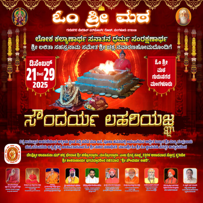 ಮಂಗಳೂರು : ಲೋಕಕಲ್ಯಾಣಾರ್ಥವಾಗಿ ಸನಾತನ ಧರ್ಮ ಸಂರಕ್ಷಣಾರ್ಥ ಮಂಗಳೂರಿನ ಓಂ ಶ್ರೀ ಮಠದಲ್ಲಿ ಡಿಸೆಂಬರ್ 21ರಿಂದ 29ರವರೆಗೆ ಶ್ರೀ ಲಲಿತಾ ಸಹಸ್ರನಾಮ ಸಮೇತ ಶ್ರೀ ಚಕ್ರ ನವಾರಣ ಹೋಮದೊಂದಿಗೆ ಸೌಂದರ್ಯ ಲಹರಿ ಯಜ್ಞ ನಡೆಯಲಿದೆ ಎಂದು ಓಂ ಶ್ರೀ ಮಠದ ವಿದ್ಯಾನಂದ ಸರಸ್ವತಿ ಸ್ವಾಮೀಜಿ ಹೇಳಿದ್ದಾರೆ.