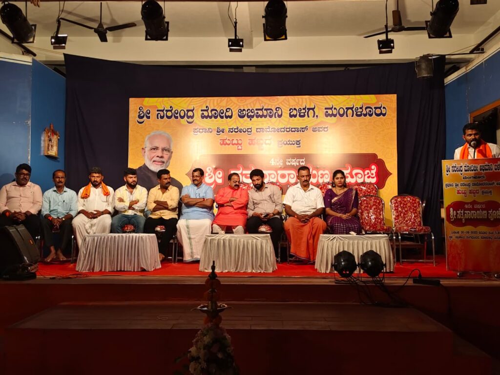 ಮಂಗಳೂರು ; ಶಿಕ್ಷಣ, ಕೃಷಿ, ಆರೋಗ್ಯ, ವಿದೇಶ ವ್ಯವಹಾರ, ಸಾರಿಗೆ, ರಕ್ಷಣೆ, ಸಿಂಧೂರ ಅಪರೇಷನ್, ವಿಜ್ಞಾನ ಹಾಗೂ ವಿವಿಧ ಕ್ಷೇತ್ರಗಳಲ್ಲಿ ಅಭೂತಪೂರ್ವ ಸಾಧನೆಗೈದ ನಮ್ಮ ಹೆಮ್ಮೆಯ ಪ್ರಧಾನಿ ಶ್ರೀ ನರೇಂದ್ರ ದಾಮೋದರ್ದಾಸ್ ಮೋದಿಯವರ ಹುಟ್ಟುಹಬ್ಬದ ಪ್ರಯುಕ್ತ ಅವರ ಆರೋಗ್ಯ ಆಯಸ್ಸು ಹಾಗೂ ದೇಶದ ಅಭಿವೃದ್ಧಿ ಹಾಗೂ ರಕ್ಷಣೆಗೆ ಇನ್ನೂ ಶಕ್ತಿ ತುಂಬಲು ಶ್ರೀ ಚಂದ್ರಹಾಸ ಭಟ್ ಇರುವೈಲು ನೇತೃತ್ವದಲ್ಲಿ ಶ್ರೀ ನರೇಂದ್ರ ಮೋದಿ ಅಭಿಮಾನಿ ಬಳಗ ಮಂಗಳೂರು ವತಿಯಿಂದ 4 ನೇ ವರ್ಷದ ಶ್ರೀ ಸತ್ಯನಾರಾಯಣ ಪೂಜೆ ಇಂದು ವಜ್ರಕಾಯ ರಂಗಮಂದಿರ ಜೋಡುಕಟ್ಟೆ ಮರೋಳಿಯಲ್ಲಿ ನಡೆಯಿತು.