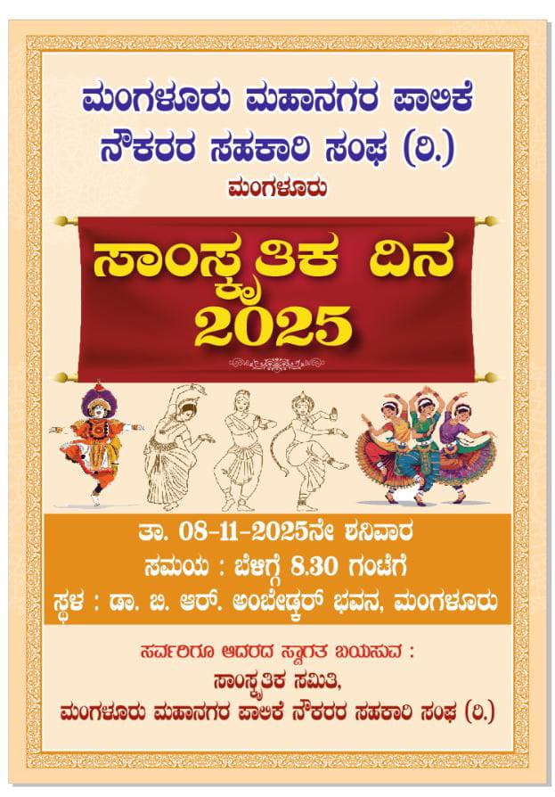 ಮಂಗಳೂರು ; ಮಂಗಳೂರು ಮಹಾನಗರ ನೌಕರರು ಸಹಕಾರ ಸಹಕಾರಿ ಸಘದ ವತಿಯಿಂದ 100 ನೇ ವರ್ಷದ ಪ್ರಯುಕ್ತ ನಾಳೆ ಉರ್ವಾಸ್ಟೋರ್ ಬಳಿಯ ಡಾ. ಅಂಬೇಡ್ಕರ್ ವೇದಿಕೆಯಲ್ಲಿ ಮಂಗಳೂರು ಮಹಾನಗರ ಪಾಲಿಕೆಯ ನೌಕರರು ಹಾಗೂ ಕುಟುಂಬ ವರ್ಗದವರಿಗೆ ಸಾಂಸ್ಕೃತಿಕ ದಿನಾಚರಣೆಯ ಕಾರ್ಯಕ್ರಮವನ್ನು ಹಮ್ಮಿಕೊಳ್ಳಲಾಗಿದೆ.