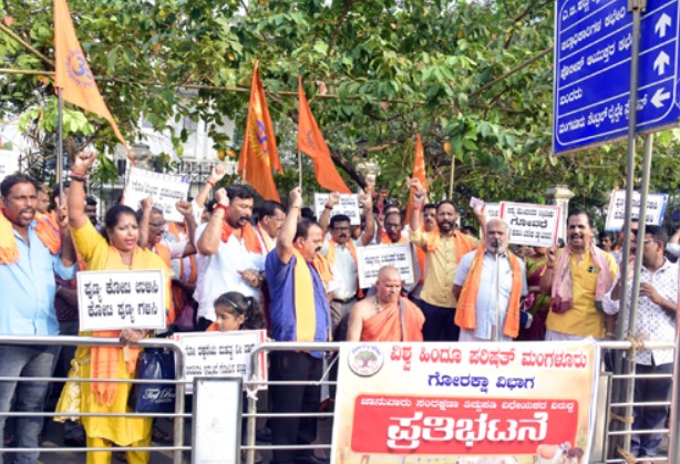 ಮಂಗಳೂರು : ಕರ್ನಾಟಕ ಗೋಹತ್ಯೆ ತಡೆ ಮತ್ತು ಗೋ ಸಂರಕ್ಷಣಾ ಕಾಯ್ದೆ, 2020 ಅನ್ನು ರಾಜ್ಯ ಸರ್ಕಾರ ದುರ್ಬಲಗೊಳಿಸಲು ಪ್ರಯತ್ನಿಸುತ್ತಿದೆ ಎಂದು ಆರೋಪಿಸಿ ವಿಶ್ವ ಹಿಂದೂ ಪರಿಷತ್ (ವಿಎಚ್ಪಿ) ಮತ್ತು ಬಜರಂಗದಳ ಸದಸ್ಯರು ಸೋಮವಾರ ಮಂಗಳೂರಿನಲ್ಲಿ ಪ್ರತಿಭಟನೆ ನಡೆಸಿದರು.