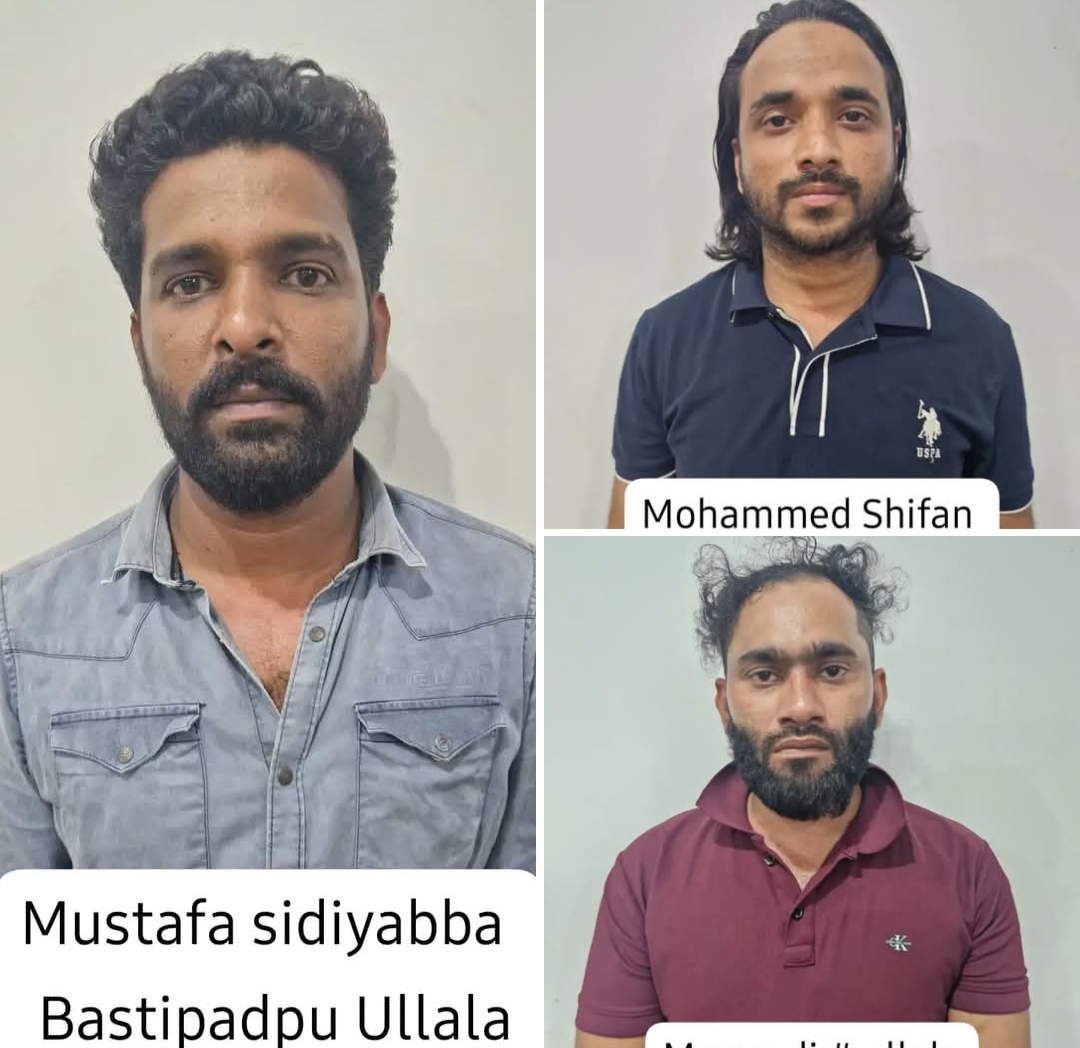 ಬಂಧಿತರನ್ನು ಉಳ್ಳಾಲ ನಿವಾಸಿಗಳಾದ ಮುಸ್ತಫಾ ಸೀದಿಯಬ್ಬ (34 ) ಮೈಯದ್ದಿ (28 ) ಮೊಹಮ್ಮದ್ ಶಿಫಾನ್ (28) ಎಂದು ತಿಳಿದಿದೆ.