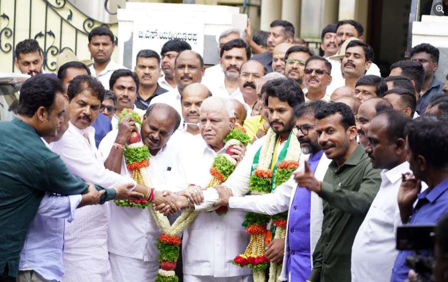 ರಾಮನಗರ : ಚನ್ನಪಟ್ಟಣ ವಿಧಾನಸಭಾ ಉಪಚುನಾವಣೆ ರಂಗೇರಿದ್ದು ಅದರಲ್ಲೂ ತೀವ್ರ ಕುತೂಹಲ ಮೂಡಿಸಿದ್ದ ಎನ್ಡಿಎ ಅಭ್ಯರ್ಥಿ ಕೊನೆಗೂ ಘೋಷಣೆಯಾಗಿದೆ. ಚನ್ನಪಟ್ಟಣ ವಿಧಾನಸಭಾ ಕ್ಷೇತ್ರದ ಉಪಚುನಾವಣೆಯಲ್ಲಿ ಎನ್ಡಿಎ ಅಭ್ಯರ್ಥಿಯಾಗಿ ನಿಖಿಲ್ ಕುಮಾರಸ್ವಾಮಿಯನ್ನು ನಿಂದ ಮೈತ್ರಿಕೂಟ ಕಣಕ್ಕೆ ಇಳಿಸಿದೆ. ನಾಮಪತ್ರ ಸಲ್ಲಿಕೆಗೆ ನಾಳೆ ಒಂದು ದಿನ ಬಾಕಿ ಇರುವಾಗಲೇ ಬಿಜೆಪಿ-ಜೆಡಿಎಸ್ ಮೈತ್ರಿ ಅಭ್ಯರ್ಥಿ ಹೆಸರು ಪ್ರಕಟವಾಗಿದ್ದು, ಅಳೆದು ತೂಗಿ ಕೊನೆ ಕ್ಷಣದಲ್ಲಿ ನಿಖಿಲ್ ಕುಮಾರಸ್ವಾಮಿ ಅವರಿಗೆ ಮಣೆಹಾಕಲಾಗಿದೆ. ಬಿಎಸ್ ಯಡಿಯೂರಪ್ಪ ನಿವಾಸದಲ್ಲಿಂದು ನಡೆದ ಜೆಡಿಎಸ್-ಬಿಜೆಪಿ ನಾಯಕರ ಸಮನ್ವಯ ಸಭೆ ಬಳಿಕ ನಿಖಿಲ್ ಹೆಸರು ಘೋಷಣೆ ಮಾಡಲಾಯಿತು. ಸ್ವತಃ ಯಡಿಯೂರಪ್ಪ ಅವರೇ ಚನ್ನಪಟ್ಟಣ ಕ್ಷೇತ್ರದಲ್ಲಿ ಎನ್ಡಿಎ ಅಭ್ಯರ್ಥಿಯಾಗಿ ನಿಖಿಲ್ ಸ್ಪರ್ಧಿಸುತ್ತಾರೆ ಎಂದು ಘೋಷಿಸಿದ್ದಾರೆ.