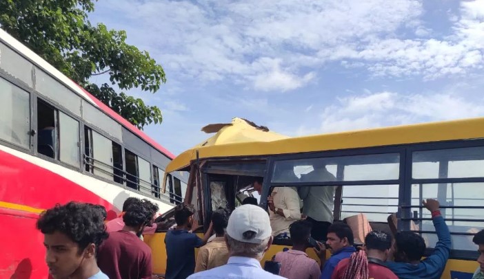 ರಾಯಚೂರು : ರಾಯಚೂರು ಜಿಲ್ಲೆಯ ಮಾನ್ವಿ ತಾಲೂಕಿನ ಕಪಗಲ್ ಬಳಿ ಸಾರಿಗೆ ಬಸ್​, ಶಾಲಾ ಬಸ್​ ನಡುವೆ ಭೀಕರ ಅಪಘಾತದಲ್ಲಿ ಇಬ್ಬರು ವಿದ್ಯಾರ್ಥಿಗಳು ಸಾವನ್ನಪ್ಪಿರುವಂತಹ ಘಟನೆ ನಡೆದಿದೆ.