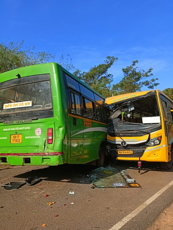 ಶಿವಮೊಗ್ಗ ಜಿಲ್ಲೆ ಸಾಗರ ತಾಲ್ಲೂಕಿನಲ್ಲಿ ಮುಂಜಾನೆ ಈ ಘಟನೆ ನಡೆದಿದ್ದು ಅದೃಷ್ಟವಶಾತ್ ದೊಡ್ಡ ದುರಂತ ತಪ್ಪಿದೆ. ಸಾಗರದಿಂದ ಸಿಗಂದೂರಿಗೆ ತೆರಳುತಿದ್ದ ಸರ್ಕಾರಿ ಬಸ್ ಹಾಗೂ ಸಾಗರಕ್ಕೆ ಬರುತಿದ್ದ ಖಾಸಗಿ ಶಾಲಾ ವಾಹನ ನಡುವೆ ಅಪಘಾತ ಸಂಬಂಧಿಸಿದ್ದು ಅಪಘಾತದಲ್ಲಿ ಎರಡು ಬಸ್ ಚಾಲಕರು ಗಂಭೀರ ಗಾಯಗಳಾಗಿದೆ.